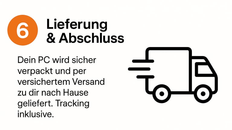 Dein PC wird gut geschützt verpackt und per versichertem Versand verschickt. Du bekommst eine Sendungsverfolgung – und falls du den Bau live verfolgt hast, auch einen Link zum Highlight-Video.